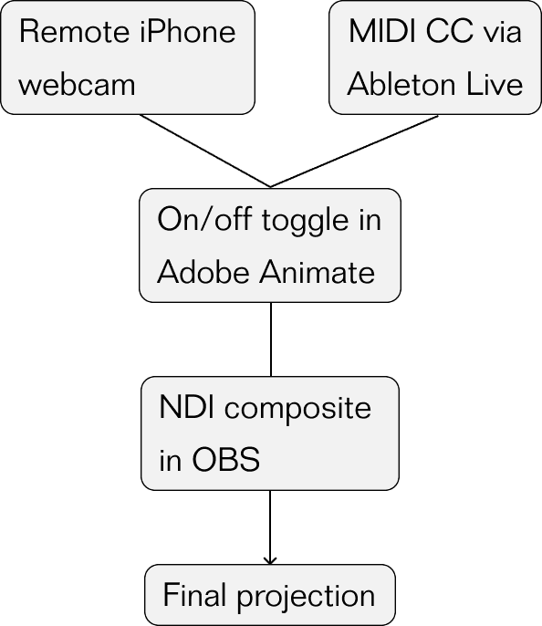 A music video built around a real-time motion-tracking system. Live movement is captured and translated into animation, composited in real time over projected visuals that respond to the song. Music, performance, and projection operate as a single responsive system rather than separate layers.