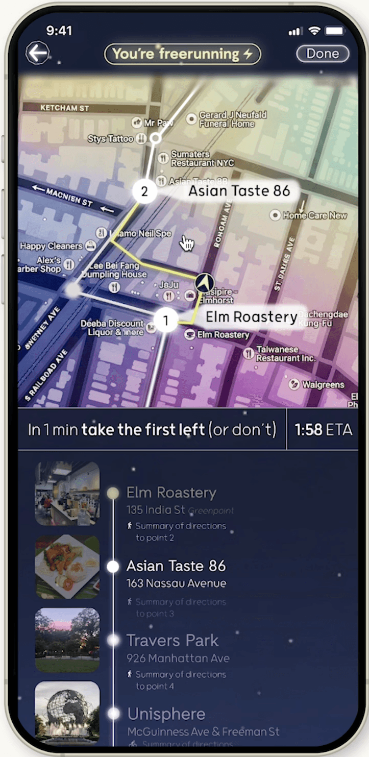 Orion’s aura-based routing system offers a non-prescriptive way to guide users based on taste. As users complete quests, they develop an aura informed by where they’ve been and how they explore. This allows personalization to emerge organically over time.