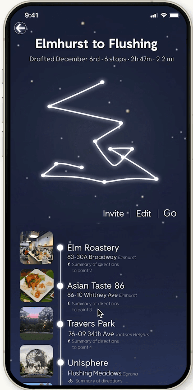 Rather than optimizing for efficiency, Orion reframes planning as expression. Outings are quests, routes are constellations, and navigation remains intentionally flexible.